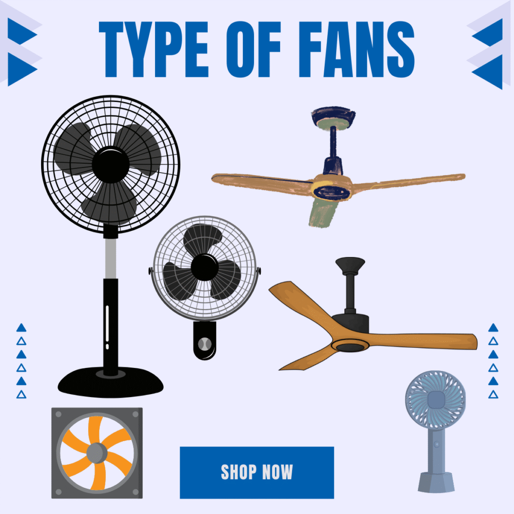 ceiling fans, pedestal fans, wall-mounted fans, and exhaust fans.